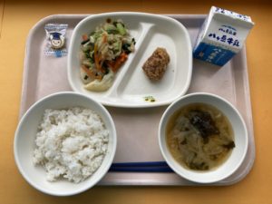 2024年10月31日 / 最終更新日時 : 2024年11月1日 長坂小 給食 図書給食④ 4日目の今日は「どうぞめしあがれ」に登場する鶏の唐揚げです。このお話にはいくつか料理が出てきて、どれも美味しそうですが、子どもに人気のある唐揚げを選びました。 麦ごはん・鶏の唐揚げ・たくあんの和え物・たまねぎの味噌汁・チーズ