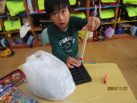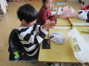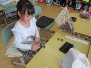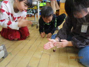 自分たちで拾ったどんぐりがおもちゃのこまになり,嬉しそうに何度もこまを回して遊びました。