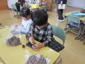 今日の生活科では,校外学習で拾ってきたどんぐりを使って「どんぐりごま」を作りました。拾ったどんぐりをよく観察し,ひびの入っていないどんぐりを選び,錐で穴をあけました。錐を使うのが初めてという子もいましたが,台を使って安全に行うことができました。