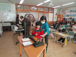 その後は,糸車で糸をつむぐ体験をしました。綿をやさしく引いて,もう片方の手で糸車を回しながらつむぎました。綿が細い糸になっていくところをよく観察していました。郷土資料館の方が子どもたちに寄り添って,丁寧に教えてくださいました。