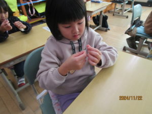 物語にでてくるたぬきは糸のたばを山のように作るのですが,体験を通して,「どのくらい時間がかかったのかな。」や「すごい大変だよね。」と想像することができました。とても貴重な体験ができました。