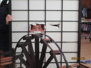 やぶれしょうじから友達が糸車を回す様子を見る体験もさせていただきました。物語に出てくるたぬきになりきって,目をクルクル回しながらのぞいている子どもたちでした。