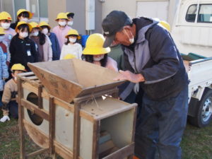 木曜日に、収穫して干しておいた大豆を脱穀しました。大豆をブルーシートの上で叩き、鞘から実をとり出しました。中から大豆が出てくると、とても大切そうに一粒ずつ拾っていました。その後、「とうみ」という機械にかけてゴミと大豆の分別を行いました。昔ながらの道具に、子どもたちはとても興味津々で、楽しそうにとうみを回していました。取れた大豆を使って、3学期には豆腐作りなどを行っていきたいと思います。