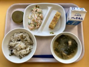 かてめし・五目厚焼きたまご・さつまいもサラダ・小松菜の味噌汁・抹茶クリームパンケーキ・牛乳