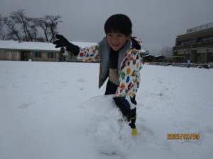 友達と雪合戦を思いっきり楽しむ子,「大きな雪だるまを作る!」といって雪を転がしている子,真っ白な雪に倒れてダイブしている子,思い思いに雪遊びを楽しみました。