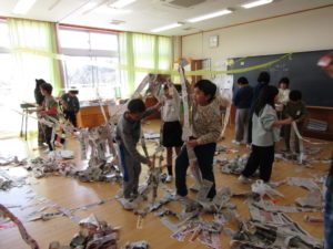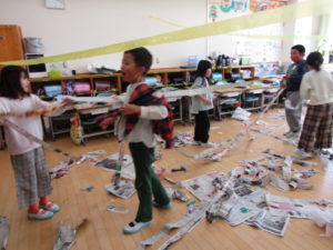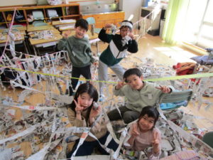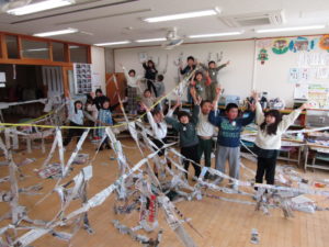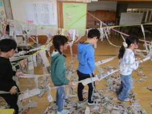 図工では、紙を切って、つなげて、それをつるして遊びました。つなげるときには、長くつなげたり、短くちぎったりして出来上がりを考えて協力して作業をしました。つるす場面では、みんなで声をかけ合って場所を確認しながらつるしていました。教室いっぱいにつなげてつるして、楽しい空間になりました。出来上がった作品の下で楽しそうに遊んでいる姿が印象的です。