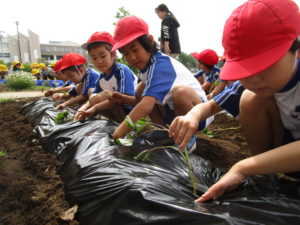 生活科の時間にサツマイモの苗を植え、アサガオの種をまきました。子どもたちが知っていることや事前に調べてきたことを出し合い、どのように育てたら大きくなるか考えました。