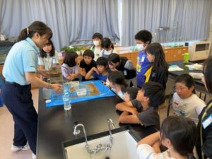 事前学習として,私たちは水循環の中で生活をしており,水循環に影響を及ぼすこともあるということを学びました。授業ではスライドを見ながら,「どんな森が豊かな水を育むことが出来るのか」,「雨水が地下水となって濾過され,私たちの手元に届くまでには20年もの長い年月がかかっていること」,「これからも大切な水を守るために,私たちにできることは何か」などを学ぶことができました。2種類の土から雨水を流し,濾過されていく実験を見せていただいたのですが,子どもたちはその違いに大興奮!!楽しく学ぶことができました。