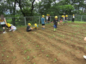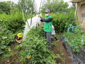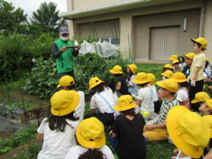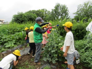 3年生は、総合で野菜作りに取り組んでいます。6月3日に、野菜の先生「堀内先生」をお迎えして、いろいろなことを教えていただきました。今日は、2回目の学習会です。堀内先生も野菜が大きくなっていることに驚いていました。さっそく、キュウリが大きくなっていることに気付き、子供たちに教えてくださり収穫しました。野菜グループごとに作業をしながら、支柱の立て方や間引きなどの世話の仕方を教えていただき、実践していました。キュウリやトマトは実がなったので、持ち帰った子もいました。1学期の最後には、みんなで「野菜パーティ」ができるといいです。2学期も堀内先生には、秋野菜について教えていただく予定です。