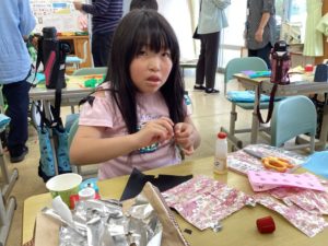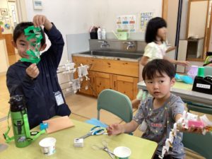 七夕の飾りづくりでは、子ども一人ひとりが折り紙を選び、ハサミやのり、テープを使って工作をしました。完成した作品を見て、笑顔になったり、慎重に折り紙を開いたり、友だちの作品を鑑賞したりする姿がありました。