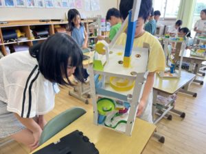 「どんなコースを作ろうかな?」「どうやって下の段へつなげよう?」「もう少し坂を急にしたらどうなるかな?」と、子どもたちは試行錯誤を重ねながら取り組んでいました。坂道コース、曲がりくねったコース、分かれ道、グルグル回る仕掛け、橋、そしてなんと一回転コースまで!