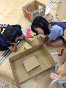 4年生の図工では、「こんな建物があったらいいな。」「こんな形の家があったらいいな。」と楽しい街の様子を想像しながら、形や色を考えて『夢の街』をつくりました。自分が入るくらいの大きな建物を作る児童もいれば、ドールハウスのような小さな建物を作る児童もいました。段ボールカッターを用いて、窓の形を切り抜いたり、好きな形に切ったりしました。また、3年生の時の「クミクミックス」の学習を生かし、段ボールに切り込みを入れて組み立てる児童もいました。