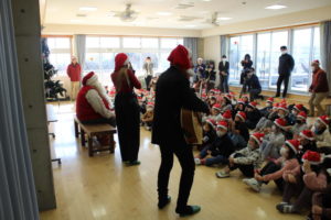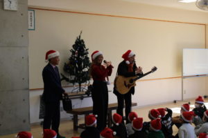 今回の会は、本校のおやじの会でもお世話になっている山梨住宅工業さんとのつながりにおいて実現しました。公認サンタさんの仲間たちがギターとハーモニカで奏でる空間の中で、フィンランドやサンタさんの日常の様子を知ることができました。一緒に歌ったフィンランドの歌を会が終わった後に早速口ずさんでいる様子も見られ、子どもたちにとって忘れられない時間になったことと思います。