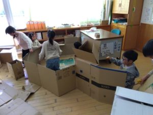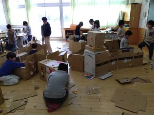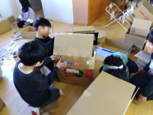 図工の学習で、ダンボールを切ったり、つなげたりして大きな作品を作り上げることができました。トイレがあったり、棚があったり、トンネルがあったりとまるで秘密基地のようです。思いついたことをどんどん試してみて、友だちと協力しながら作っていく姿は、とても楽しそうです。休み時間にも、中に入って遊んだり、さらに作品に手を入れたりしています。たくさんのダンボールを集めていただきありがとうございました。