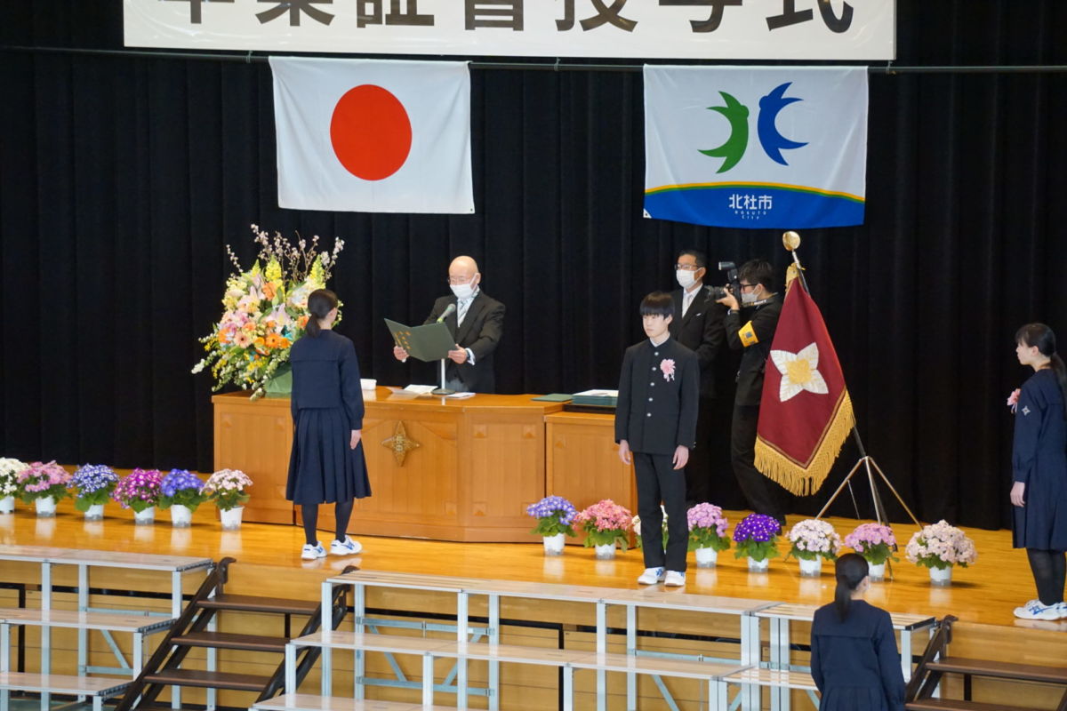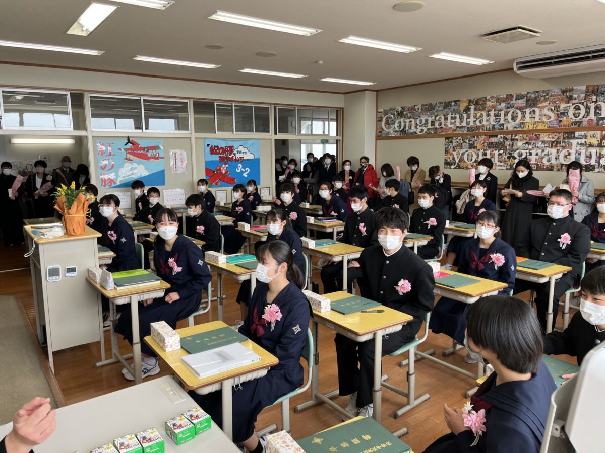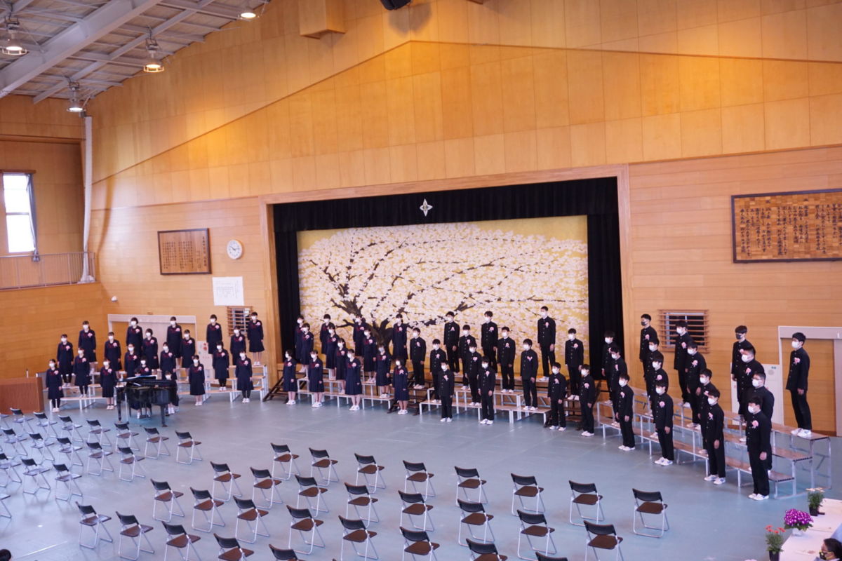 この日は、62名の卒業生と102名の在校生、教職員と来賓が参加しました。送る言葉では、「部活動に打ち込む姿、合唱への熱心な取組、各種行事で最善のパフォーマンスをする先輩への憧れ」が述べられました。これに3年生の答辞として「笑顔の似合う63人の仲間への感謝、見守ってくれた家族、先生方への感謝」を呼びかけとともに応えます。