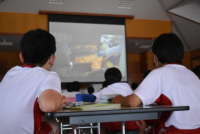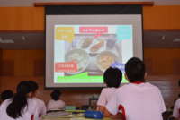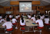 次に、毎日の給食がどのように作られているのかを、給食センターで実際に調理している様子をビデオで教えてもらいました。その日の献立によって食材や調理を担当する人が決まるそうで、担当する食材や調理が決まったら、その人は、一日中、決められた食材や調理だけを担当するそうです。