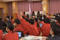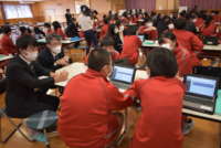 この日の授業では、「将来必要とされる仕事」や「一般的な色とは違う色の商品」を生徒が考えて、自分のアイデアをノートパソコンに入力し、それをリアルタイムでスクリーンに映し出して、全体で共有しました。教育委員会や近隣の学校の先生方も授業に加わり、生徒と直接意見を交わしました。本校以外の先生方からいろいろな見方や考え方を知ることができ、生徒にとっても大変新鮮だったようです。授業後には、「情報編集力を高めて、将来に役立てたい」「友だちや先生方の話を聞いて、自分では気づかないアイデアがたくさんあることがわかった。」など、様々な感想が出されました。