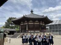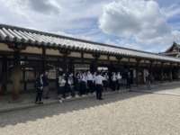 昼食をとって、法隆寺を見学しています。ガイドさんのお話もおもしろく、メモを取って学んでいます。天気は晴れです!