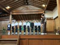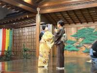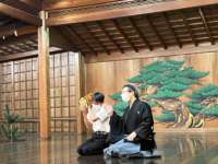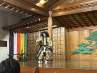 自主見学も無事終わり、能楽堂で講和と体験を行いました。本格的な舞台で衣装をつけて、舞台の体験ができました。本日の日程を終えて、全員無事ホテルに帰りました。