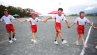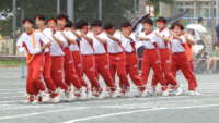 最後の競技は「ムカデリレー」です。クラスが2組に分かれてタスキをつなぎ、声を合わせて走りました。