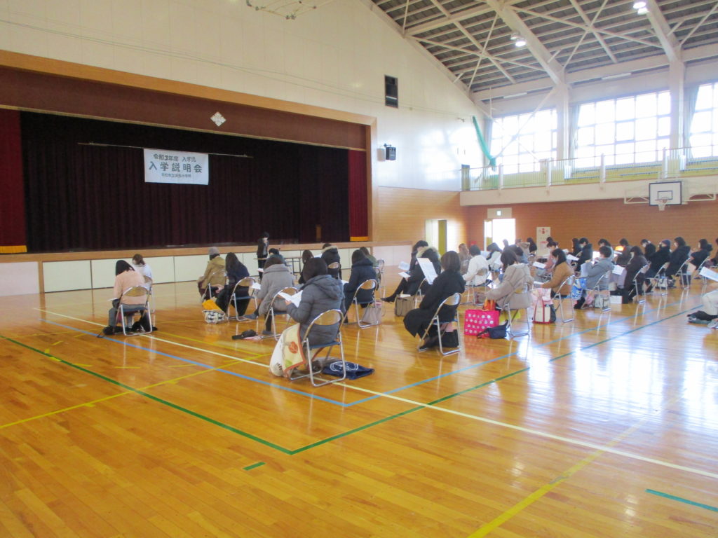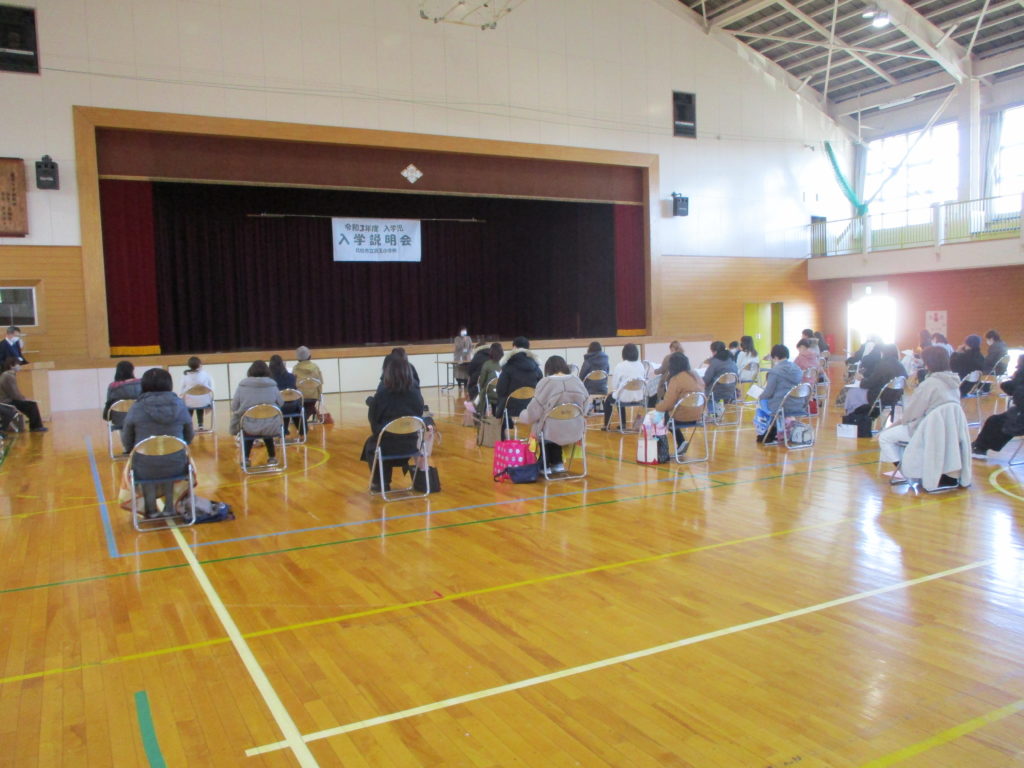 2月5日(金)に,令和3年度入学保護者説明会を行いました。新型コロナ感染症防止のため,一日入学は残念ながら中止になり,保護者のみの説明でした。体育館で,十分な距離をとったり,ドアを開けたりと感染防止に努めながら行いました。はじめに子育て支援課より話をいただき,入学までの心構えや準備品,入学にあたっての保健室からの話,学校給食,本校の教育,スクールバスについてなど,短時間ではありましたが,説明をさせていただきました。入学まであと2か月あまりになります。今回の説明会では不安を払拭することができないこともあるかもしれません。分からないことがある場合は,気軽に聞いて欲しいと思います。入学の日を職員一同お待ちしています。