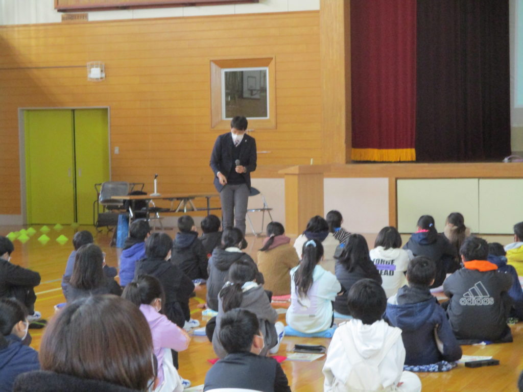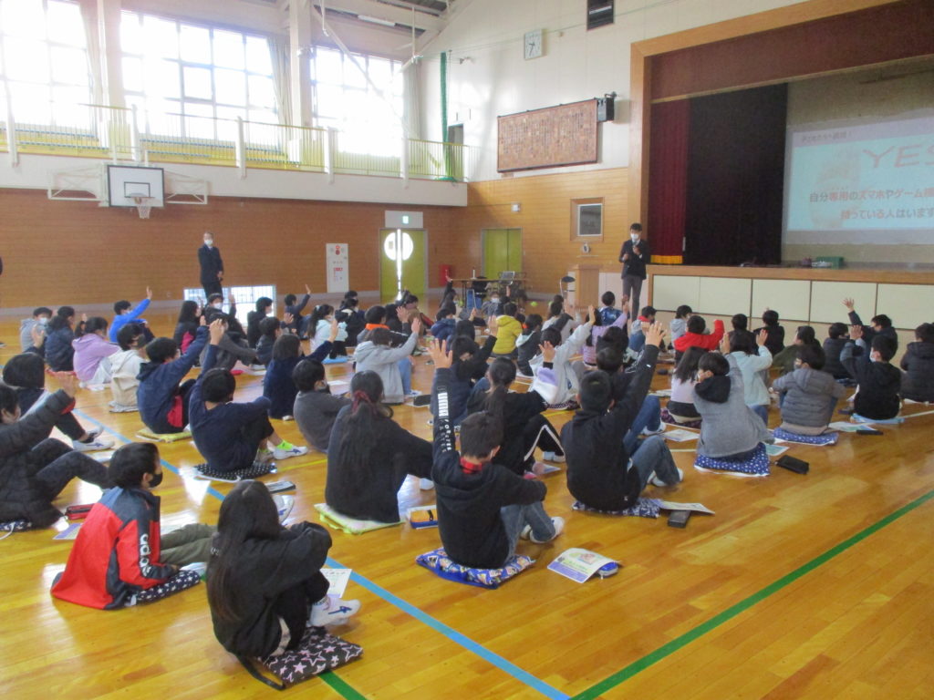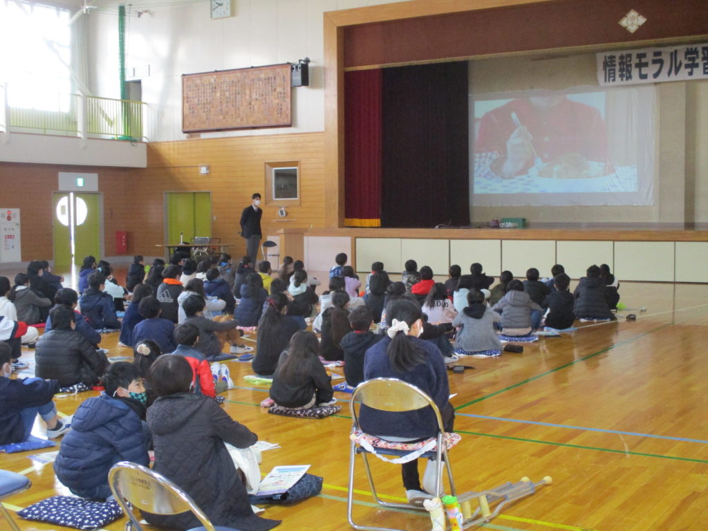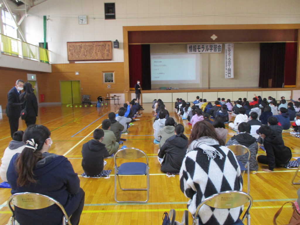 12月3日(金)に,山梨県教育庁生涯学習課から講師を迎え,情報モラル学習会を実施しました。5・6年生と希望の参加保護者が参加しました。スマートフォンによる影響や使い方,ゲームと学習時間の関係,オンラインゲームで起きている問題など,多くのことを話していただきました。Lineの友達のやりとりから問題点を探したり,何がいけないのか考えたりしながら楽しく学ぶことができました。