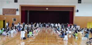 明日は、6年生が陸上記録会に出場します。そこで、頑張ってくださいという気持ちを伝える会を、全校で行いました。