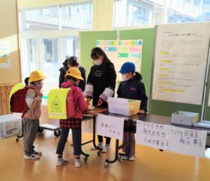 児童会の本部役員さんが、毎朝助け合い活動の物品を集めています。また、Zoomによる全校集会で、守ってほしい5つの生活目標を呼びかけていました。