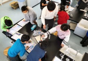 理科の実験を行っています。水を冷やし続けるとどうなるのか?みんな真剣に観察しています。