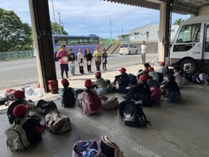 車庫にて出発式をしました。これから始まる自然教室にワクワクドキドキです。