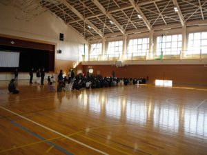 不審者が校地内に侵入した事態を想定して、避難訓練を行いました。不審者侵入時には校長室に案内(隔離)します。子どもたちは、不審者と距離をとるために、校長室から一番遠い場所(体育館)に非難します。不審者の侵入リスクを減らすために、玄関等が施錠してあることがあります。ご理解ください。