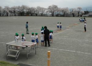 2年生が校庭で体育をしていました。2チームに分かれて、ケンケンパーをします。出会ったらじゃんけんをして、勝ったら進めます。たくさん体を動かせるだけでなく、とても楽しそうでした。