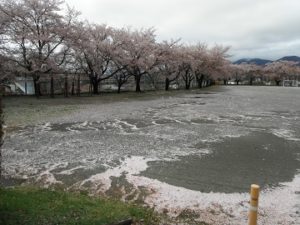 桜の花もそろそろ終わりです。校庭には花びらの模様ができていました。