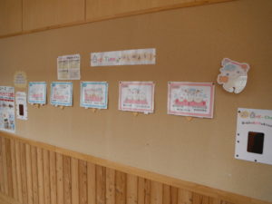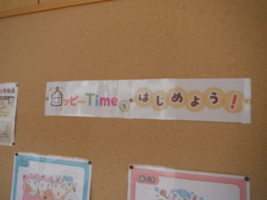 保健室前には「歯っぴーTimeをはじめよう!」が掲示されています。
