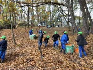 熊手や竹ぼうきなどを使って子どもたちが一生懸命に集めました。
