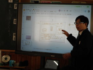 電子黒板を使いながら「共有」のしかたを、先生がわかりやすく説明していました。