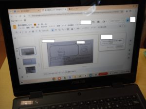 PCを使って、調べた事を「共有(お互いに見合う、感想を伝える)」していました。