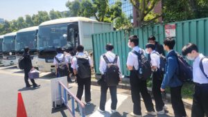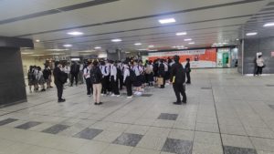 新幹線の中で早めの昼食を食べ、新大阪駅に到着しました。万博に向け、バスに乗って出発します。