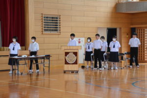 22日(木)に第1回生徒総会が行われました。全校生徒が話し合う大切な時間でしたが,一人一人が真剣に参加している姿がありました。今年度の生徒会スローガンは「開花」になりました。一人一人の個性を大切にし,全校が一つになるという意味です。この目標のもと,活発な生徒会活動になることを期待しています。