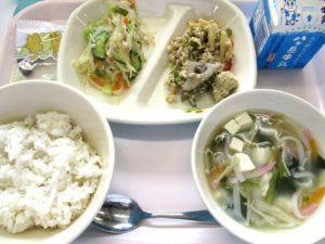 2025-08-28 / 最終更新日時 : 2025-08-28 須玉中 お知らせ ❀今日の給食❀ 今日のメニューは 麦ごはん、肉みそ、バンバンジーサラダ、 中華スープ、黒糖ビーンズ、牛乳 でした。 今日のお米、ピーマン、パプリカ、きゅうり、豆苗は北杜市産です♪