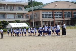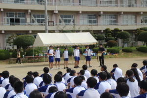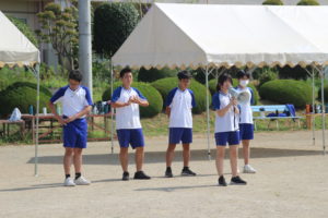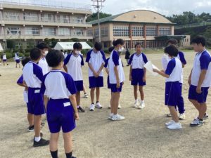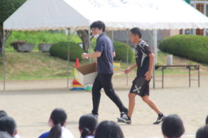 体育部門の縦割り種目の中にある障害物リレーや全校リレーについて,確認をしました。「きずな」のバトンがつながるよう,協力して練習に取り組んでいました。