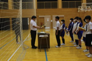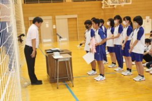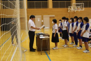 17日(金)強歩大会閉会式終了後,後期学級役員の認証式と各種大会の表彰式が行われました。最初に後期の学級役員が認証状を受け取り,リーダーとしての自覚を高めていました。また,表彰式では,支部新人大会,読書感想文コンクール,高円宮杯書道大展覧会,理科自由研究発表会で入賞した生徒が賞状を受け取りました。これからも,一人一人の良さを大切にしながら,さらに自分自身を成長させていきましょう。