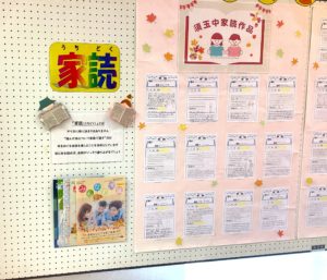 夏休みには、家読へのご協力をありがとうございました。外部への展示の承諾をいただいた作品43点を、すたま森の図書館にて展示していただいています。カウンター前には、家読で紹介された本も並べてくださっていますので、ぜひご覧ください。