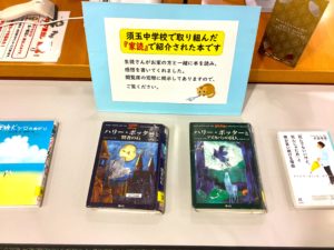 須玉中図書館では学校内の図書館だけでなく、北杜市公共図書館とも連携活動を行っています。公共図書館に生徒の家読や手作りしおりなどの作品を展示していただき、地域の皆さまにお届けしたり、中学校の図書館にはない本をお借りして授業に役立てたりと、生徒の読書活動にたくさんのご協力をいただいています。