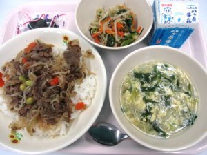 今日は、山梨県産「甲州ワインビーフ」を使った牛丼でした。