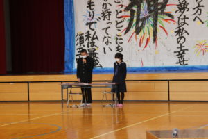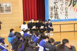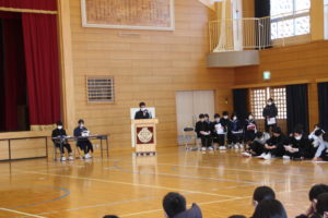 生徒総会が行われました。これまで学校の中心となって自治活動を支えてきた3年生の活動や思いが振り返られ、そのバトンが1,2年生へしっかりと手渡される場となりました。3年生のこれまでの努力に感謝するとともに、これからも生徒一人一人が主体となり、よりよい学校づくりを目指していこうとする前向きな姿を大切にしていってほしいです。
