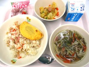 2026-03-02 / 最終更新日時 : 2026-03-02 須玉中 お知らせ ❀今日の給食❀ 今日の給食のメニューは、 ひなまつりちらし寿司、ミートオムレツ、 カラフルじゃがピー、沢煮椀、 ポンデいちごミルクドーナツ、牛乳 でした。 今日は1日早い「ひなまつり給食」です。 春を感じるひとときでした✿