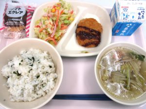 2026-03-09 / 最終更新日時 : 2026-03-09 須玉中 お知らせ ❀今日の給食❀ 今日の給食のメニューは、 わかめごはん、とんかつ照り焼きソース、 コールスローサラダ、白菜のスープ、 チョコエクレア、牛乳 でした。 具だくさんの白菜スープに入っている 「豆苗」は北杜市産です。