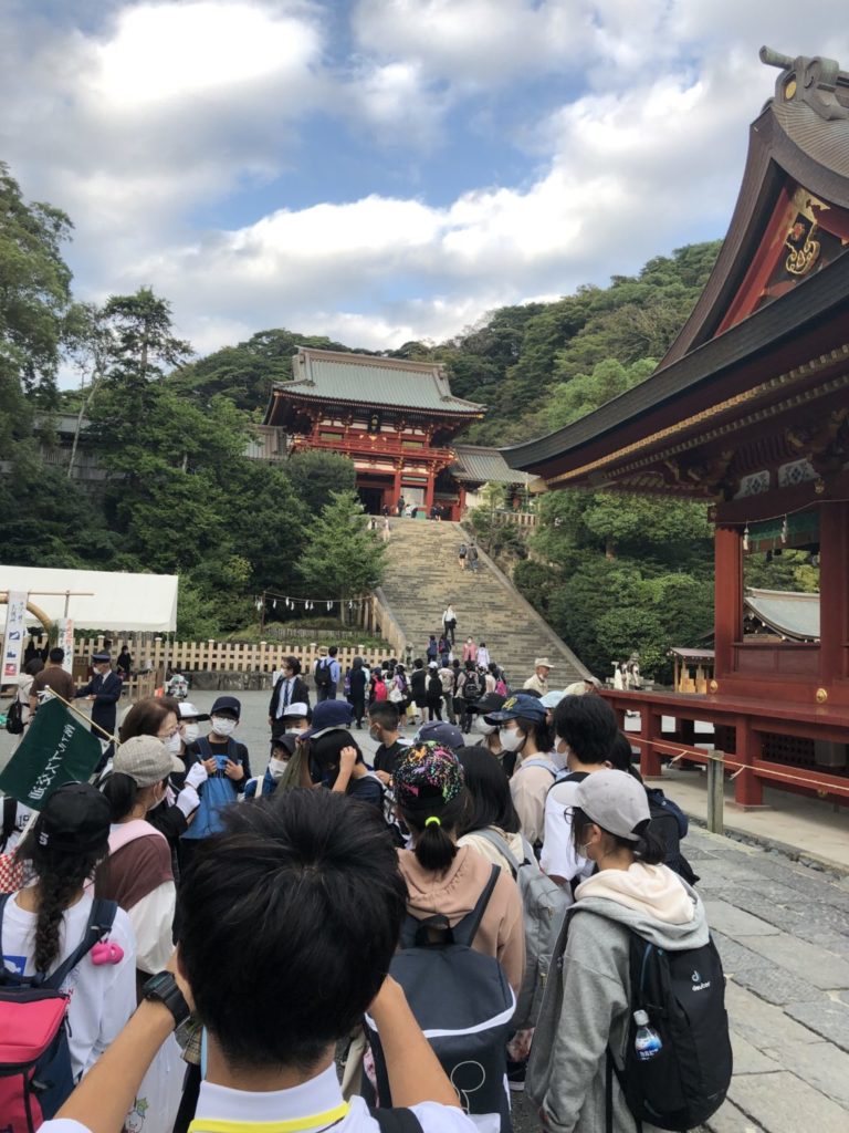 鎌倉最後の見学地は鶴岡八幡宮です。歴史の授業を思い出して、しっかりと聞いています。