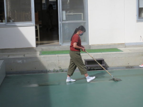 中庭は4年生担当です。毎日モップできれいにしています。